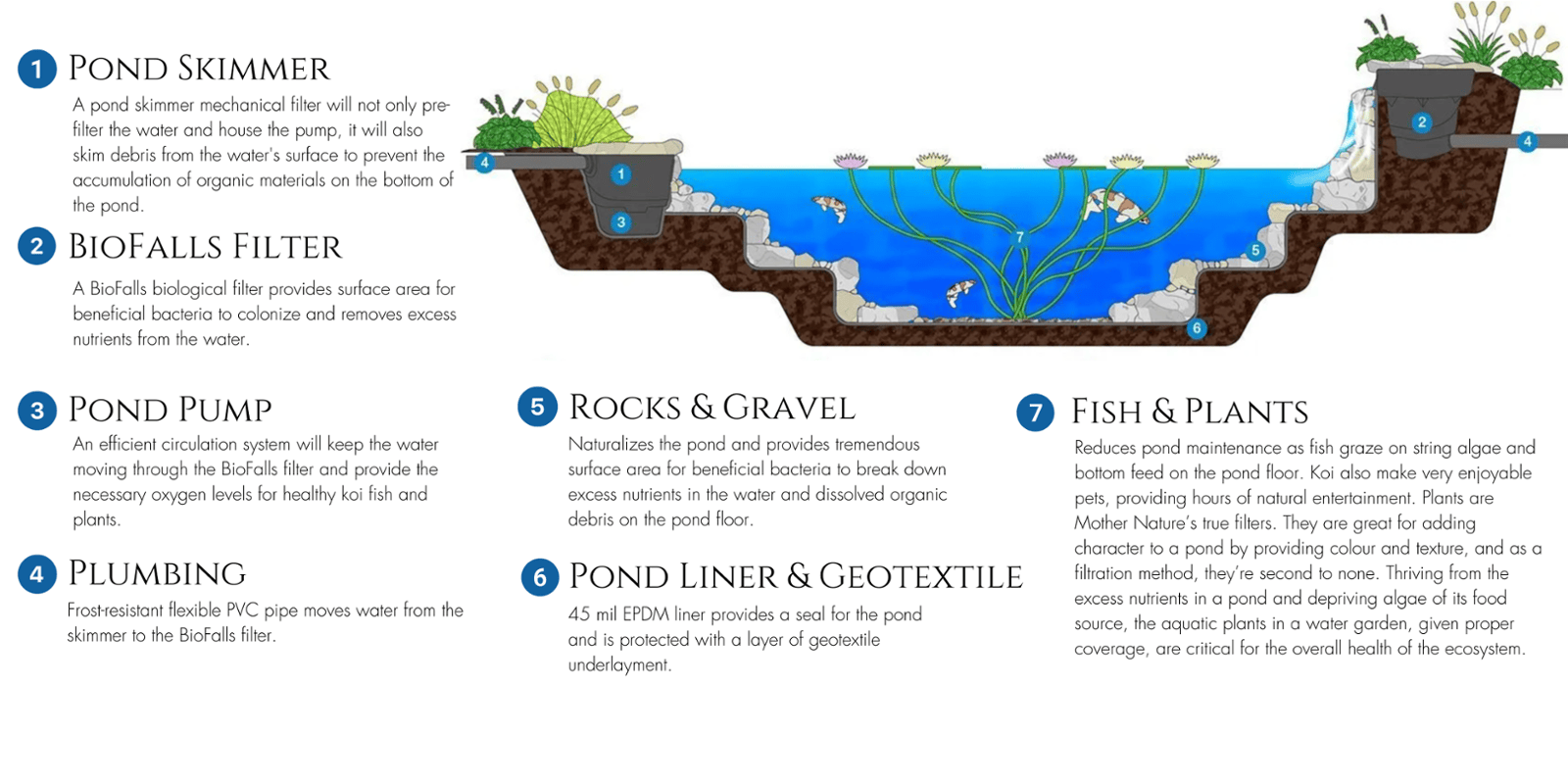 Aquatopia Ecosystem Ponds transform your backyard into a private waterfront retreat, complete with fish, plants, and the soothing sounds of running water. These self-sustaining, low-maintenance ponds not only create a relaxing escape but also support local wildlife, collect rainwater, and help protect natural waterways. With koi, water lilies, and visiting birds, your garden becomes a thriving ecosystem. Let our experts design your pond so you can enjoy a natural oasis with family and friends all summer long.